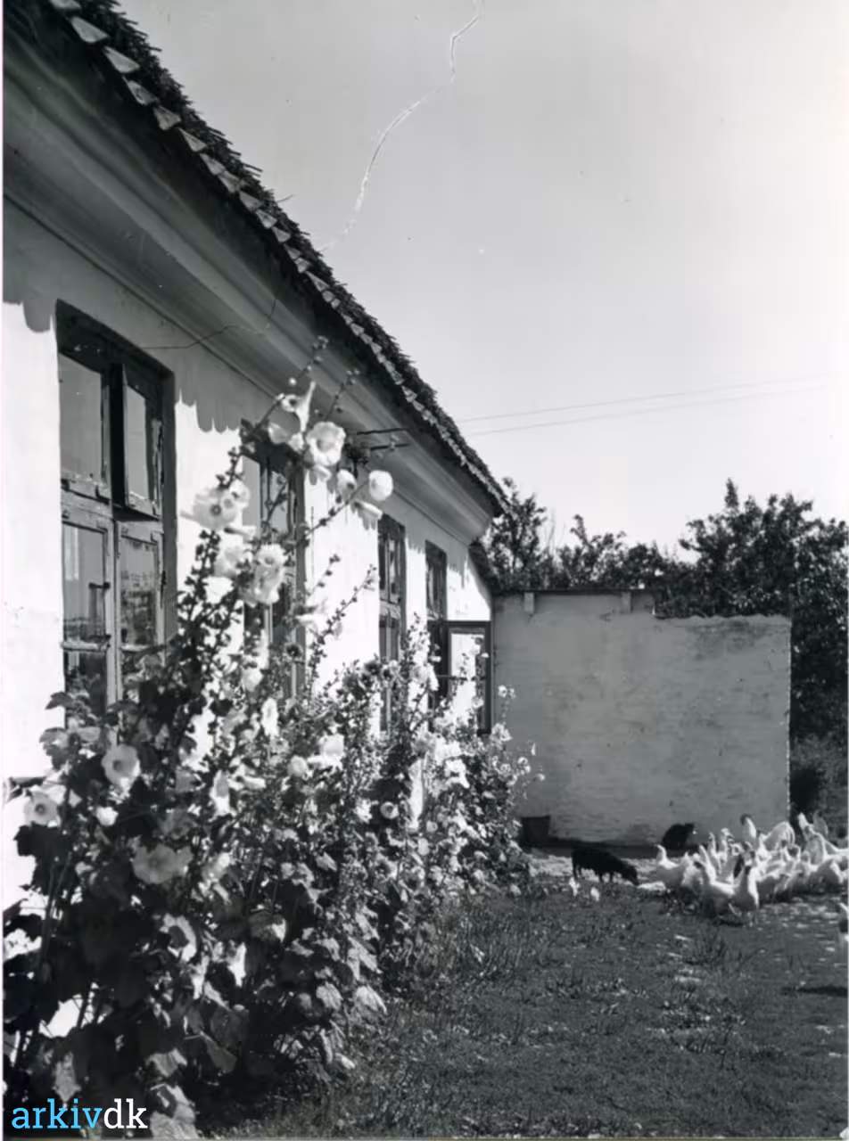 2 Stuehuset set fra én af avlsbygningerne omkring 1950. Foran en halvdør og på gårdspladsen går der høns. A. Engdorff