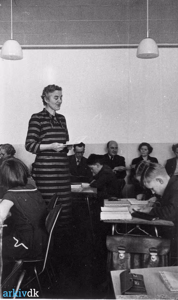 Eksamen på Hallelevskolen i over- værelse af skolekommissionen Lærer Bodil Sørensen