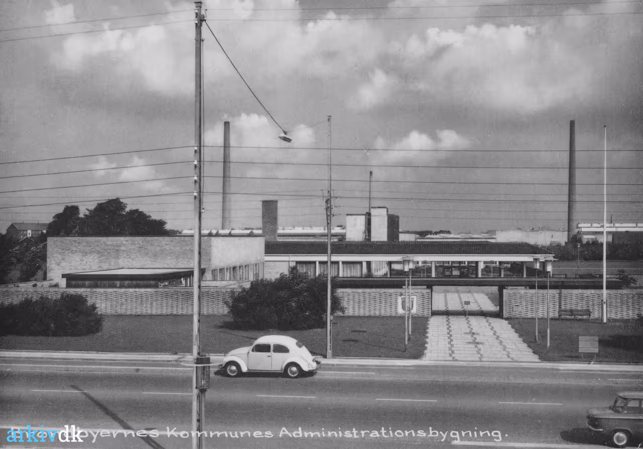 | Beskrivelse | Brøndby Rådhus (Brøndbyernes Kommunes Administrationsbygning, postkort), nybygget, kun den første fløj og byrådssalen er opført. I baggrunden ses Nordisk Kabel og Traad (NKT) og træerne på Gildhøj. I forgrunden ses en nyanlagt Park Allé. |