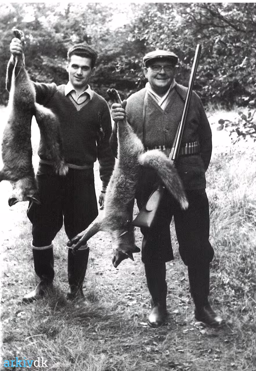 Beskrivelse Jagtbillede af Henning Daugård og Christian Skov Hansen med deres nedlagte bytte.