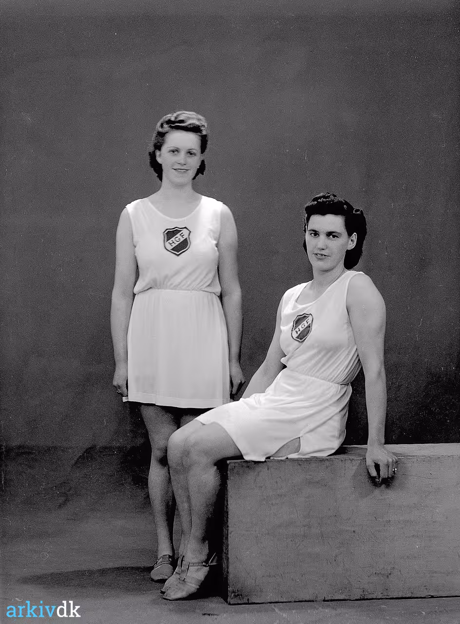 Beskrivelse To medlemmer af HGF Herning Gymnastikforening fotograferet i gymnastikdragt.