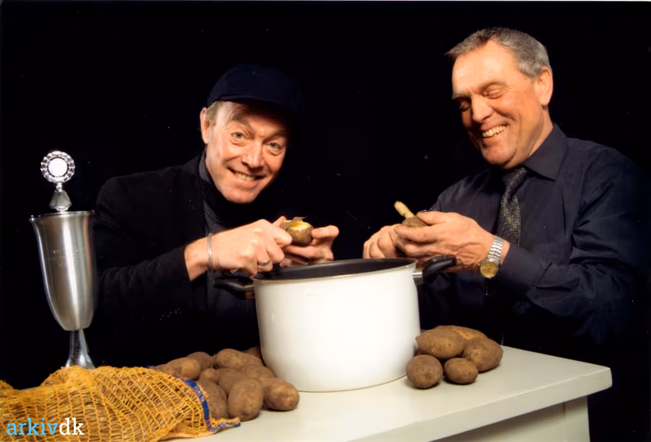 Viggo Sommer/Oluf Sand har på en genial måde gjort reklame for kartoffelavler-erhvervet, siger formanden for Dansk Kartoffelproducent-forening. Kristian Kristensen der her her skræller kartofler sammen med Viggo Sommer. |
