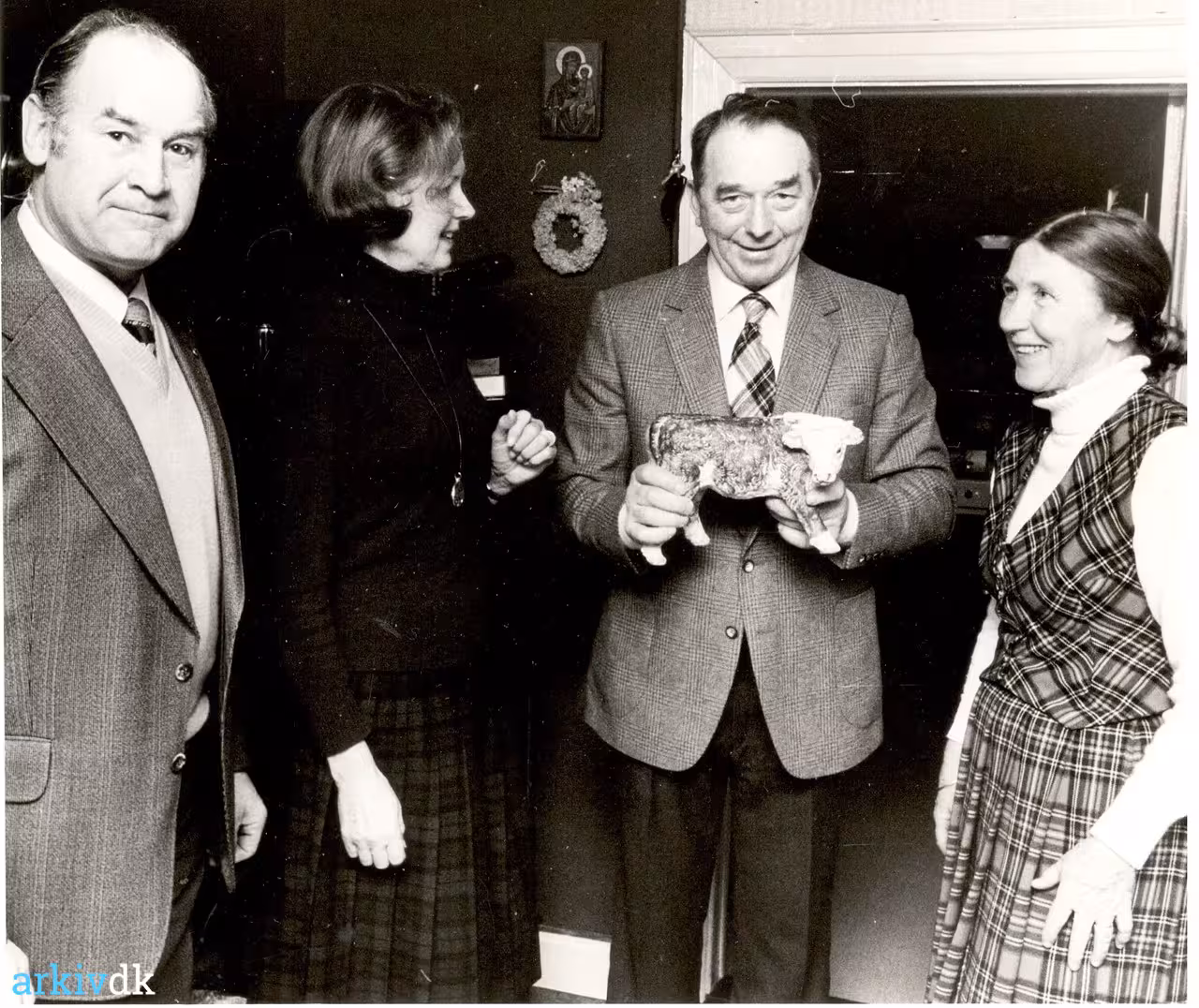 De samvirkende danske landbrugs i anledningen af organationernes 100 år, ny stiftet pris, blev 1. gang givet til Rita og Svend Aage Andersen på Tangbjergegård. Overrakt af formanden for landboforeningerne Hartvig Dehn, der står til venstre. Dernæst Gudrun Larsen billedhugger, der har udført oksen, som Svend Aage Andersen står med, samt fru Rita.