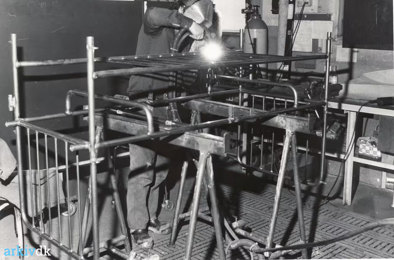 Beskrivelse Interiør fra "sengefabrikken" i Sæby. Ukendt medarbejder er i gang med svejse seng.