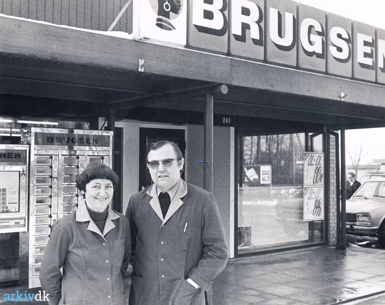 Uddelerparret Ingelise og Børge Christensen fotograferet udenfor forretningen i anledning af brugsens 75 års fødselsdag
