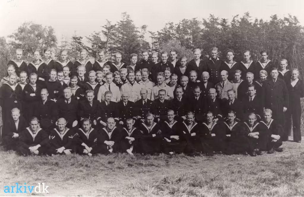 | Beskrivelse | Mandskabet (skoledelingen) i interneringslejren ved Tårnborg. Chefen for Hvidbjørn kommandørkaptajn Frederik Hempel-Jørgensen |