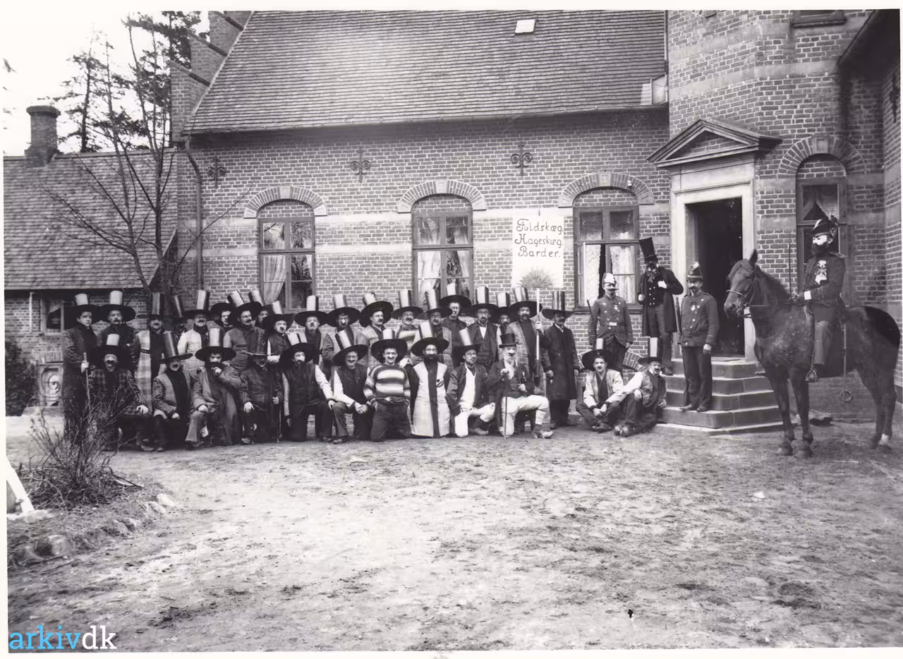 | Beskrivelse | Skægforeningen samlet foran hovedbygningen Rødkilde Højskole. Alle har skæg og er iført en høj hat. En holder et skilt hvorpå er skrevet; Fuldskæg, Hageskæg, Barder. På trappen ses 2 uniformerede herre og en med høj hat samt en til hest . |