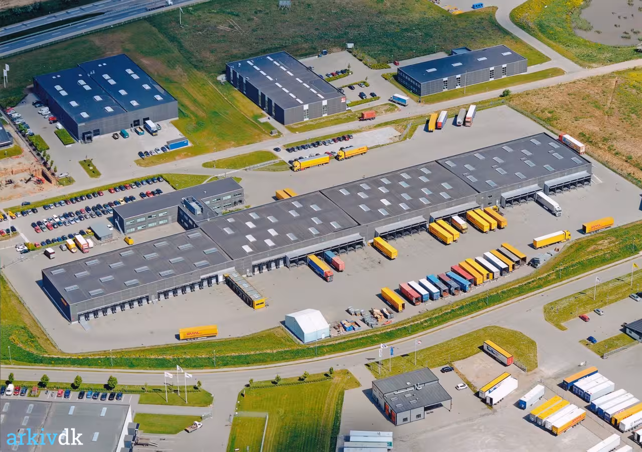 Luftfoto med fokus på tranportfirmaet DHL, Niels Bohrs Vej 37