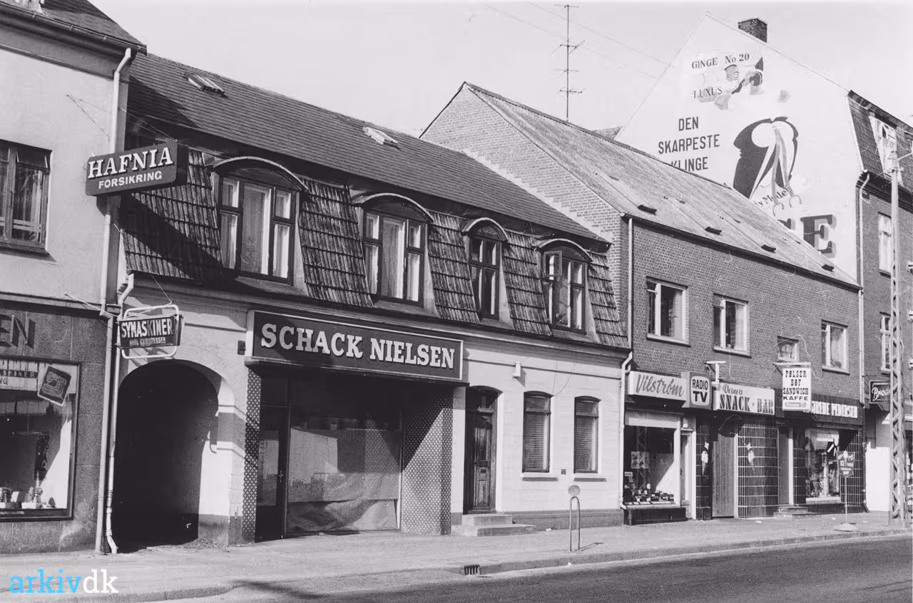 Set fra øst - Fra venstre ses den sidste vestre ende af Østergade 40 ( med A. Christensen symaskiner ), på 1. sal Hafnia forsikring. Derefter Østergade 38 med udstilling fra Schack - Nielsens farvehandel. Videre Østergade 36 med Vilstrøm radio - tv, Verners snack -bar og endelig Søstrene Petersen ( broderiforretning ). Endelig ses på gavlen af Østergade 34, manden med den skarpeste klinge ( Ginge ) |