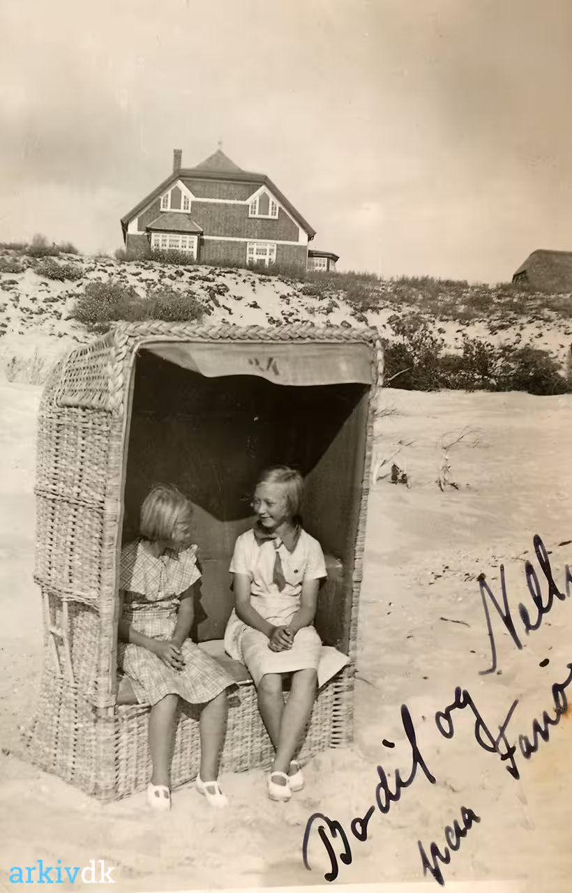 To piger fra Skovlund nyder strandlivet på Fanø. I badekabinen ses til højre Bodil Johanne Clausen, til venstre formentlig Nelly Karoline Dejbjerg Kristensen?