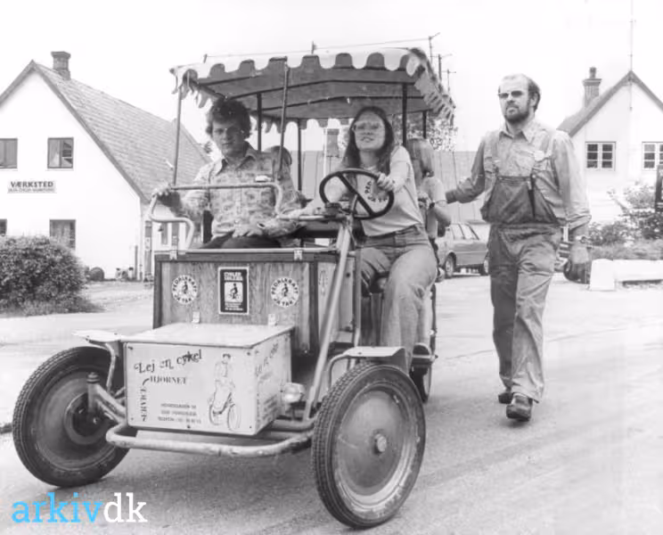| Beskrivelse | 4 personers cykel reklamerer for cykel udlejning, på Hovedgaden i Tisvilde. I bagrunden ses Servicehjørnet Hovedgaden 54 (2002) |