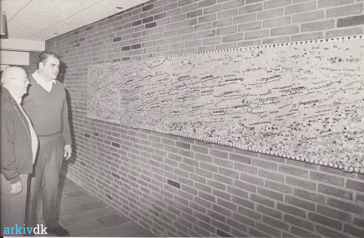 Beskrivelse Nordsøcentret, Hirtshals. Louis Nielsen og Poul Pedersen beundrer Boye Givskovs frise "Liv og lys i havet"