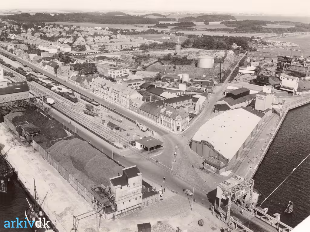 Beskrivelse Luftfoto med stadionkvarteret, Lilleø, Lilleøkajen, Th. Rasmusens Sønners kulgård, rangerområdet mellem Tårnborgvej og Jernbanevej