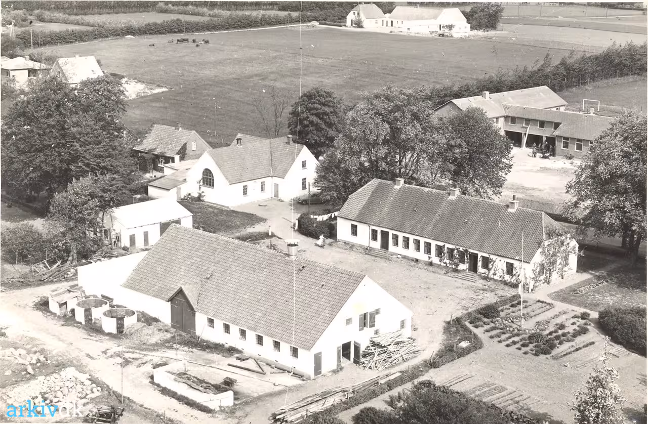 Luftfoto, set fra syd. Bemærk skolen i baggrunden. Tømrerne er endnu ikke færdige. |