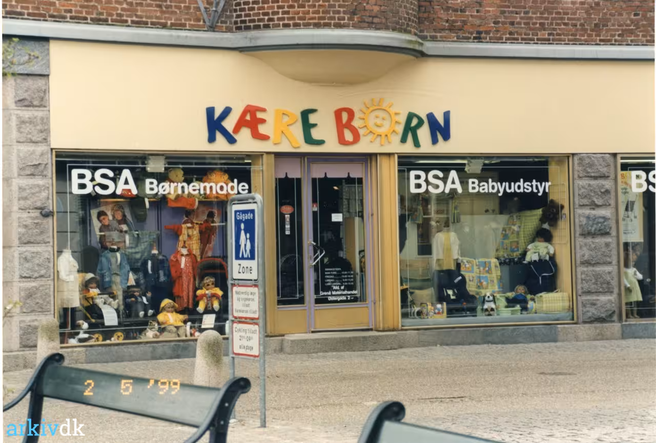 Facaden til B. S. Andersen's Barnevogns- og børnetøjsforretning efter den har ændret navn til Kære Børn.