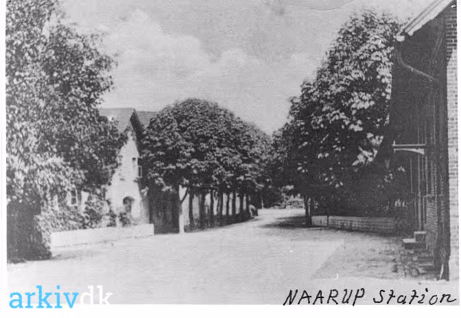 Beskrivelse Nårup station og Nårup købmandsgård. Skovsbovej 19, er købmandsgården og stationen er Skovsbovej 23. Stationen er til højre i billedet.