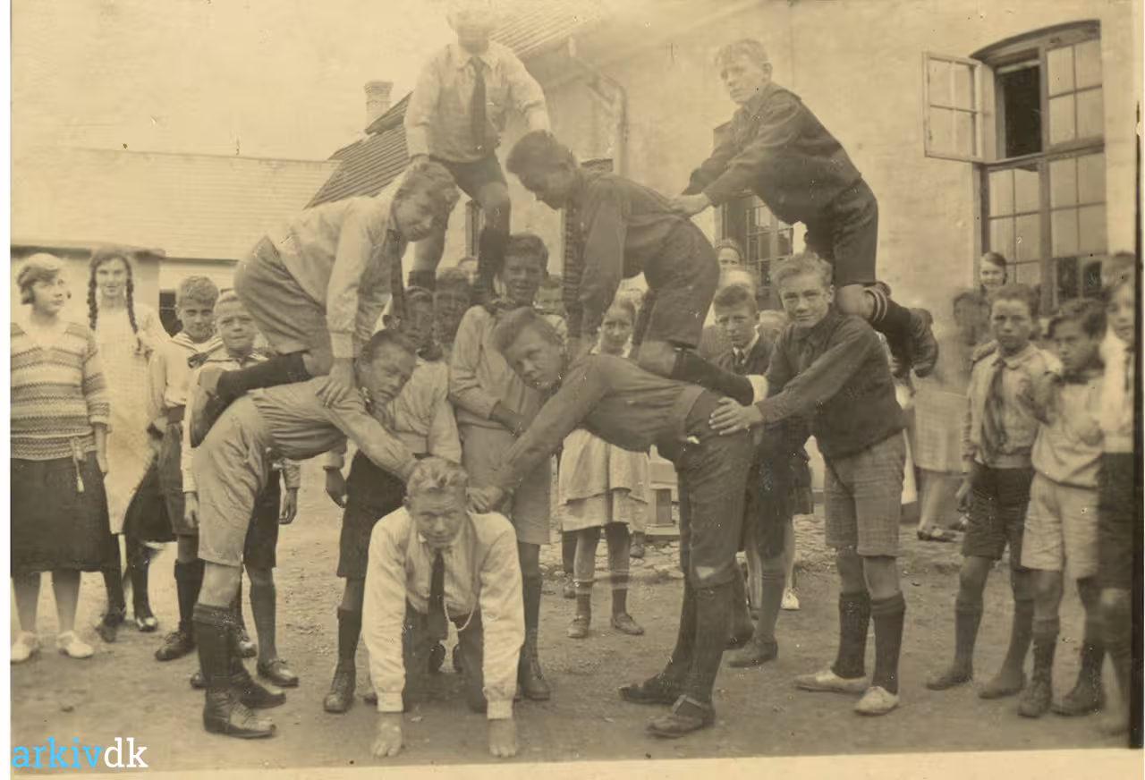 Nogle af drengene laver pyramide i skolegården. Nederst t.h. står Aksel Jensen og nederst t.v. står Johannes Christensen, bror til Marie Jensen g.m. smed Chr. Jensen, Skelbæk |