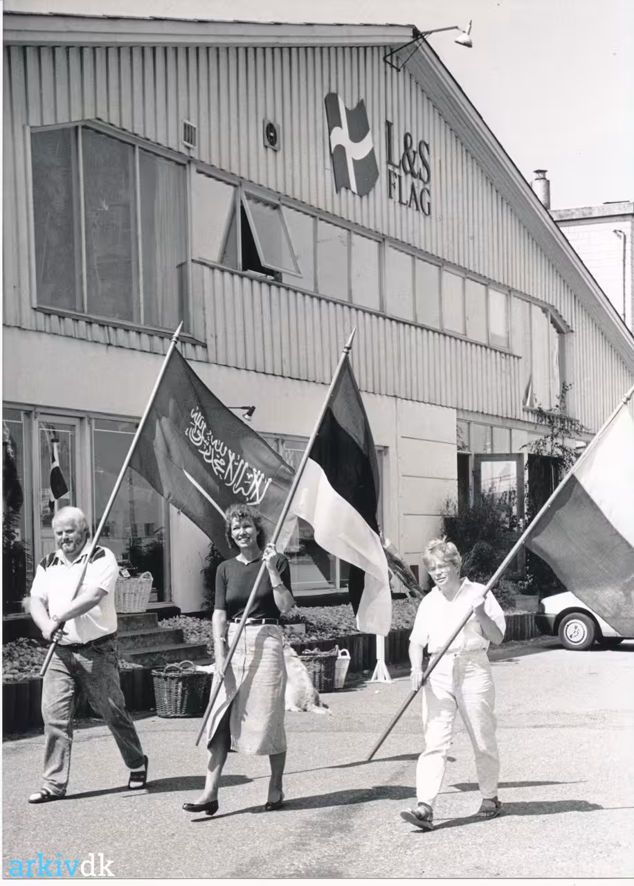 Flagfabrikken, Hjørring. L & S Flag. Flag til Dana-Cup. F.v. John Robert Larsen med Saudi Arabiens flag, Lisbeth Langkilde med det estlandske og Gitte Gaden Jensen med det polske
