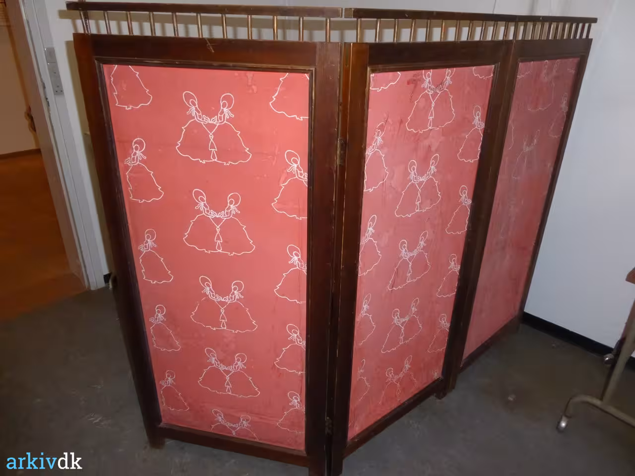 | Beskrivelse | Tredelt foldeskærm til afskærmning. Der er hvide figurer af dansende piger i lange kjoler med kyser på de tre skærme, som er holdt i rødlig tone. |