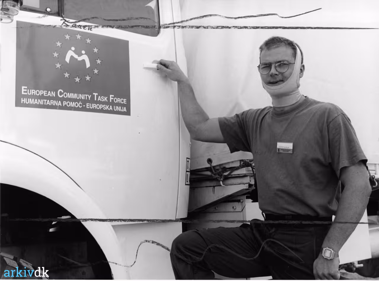 Flemming Ørum står ved en af de lastbiler, som Beredskabskorpset sendte til Bosnien i det tidligere Jugoslavien, hvor han var udsendt som korpsleder og blev hårdt kvæstet i ansigtet. I maj 1994 fik han et legat fra Beredskabskorpsets Jubilæumsfond for sin åbenhed omkring sin ulykke