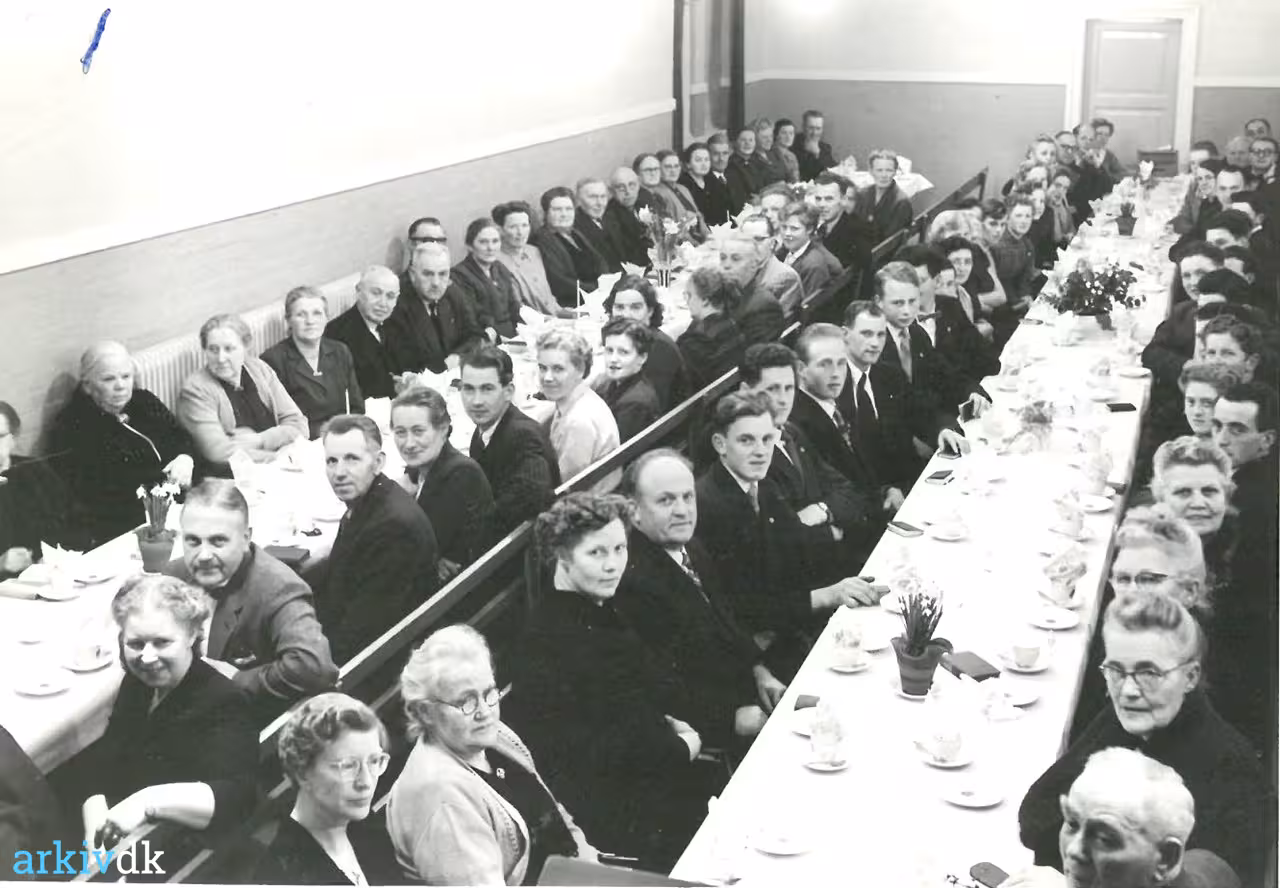 Festmiddag identificerede personer: Venstre bord. Eli Værge, Karen og Marius Jensen, lærer Dørken, Jacob Grøndal, Sejrup, overfor: Kirstine og Alfred Andreasen, Karen og Marinus Andreasen, Thyregodlund, Foran: Ingeborg Juul Nyholm, Ane Jensen, Hanne og Henry Pedersen, overfor: Ingvard og Kirstine Norlyk, Sørine og Margrethe Knudsen |