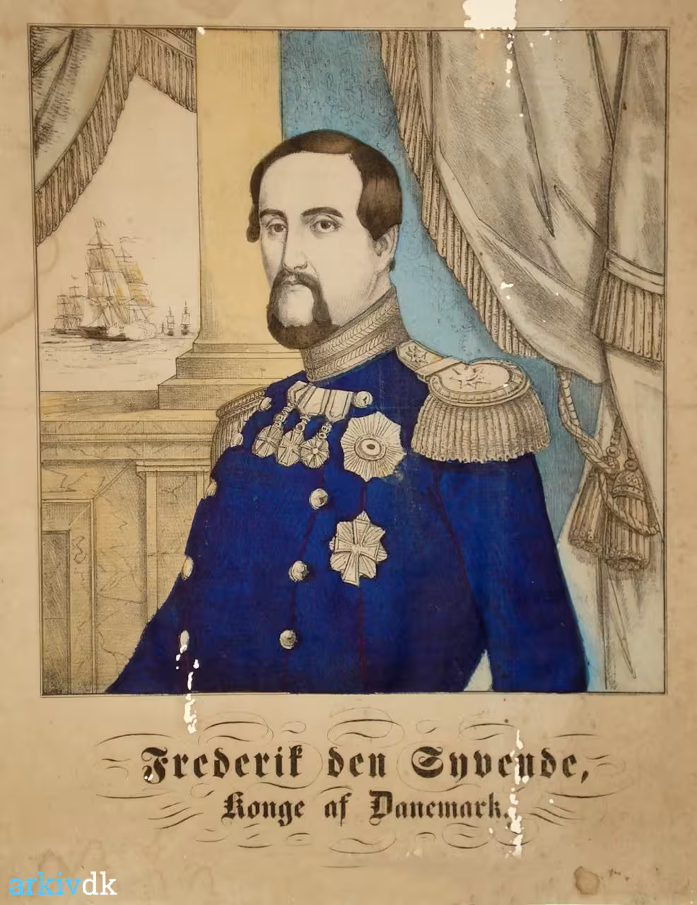 | Beskrivelse | Farvelagt litografi med portræt af kong Fredrik 7. Tekst: Frederik den Syvende, Konge af Danmark. I baggrunden ses krigsskibe i kamp.