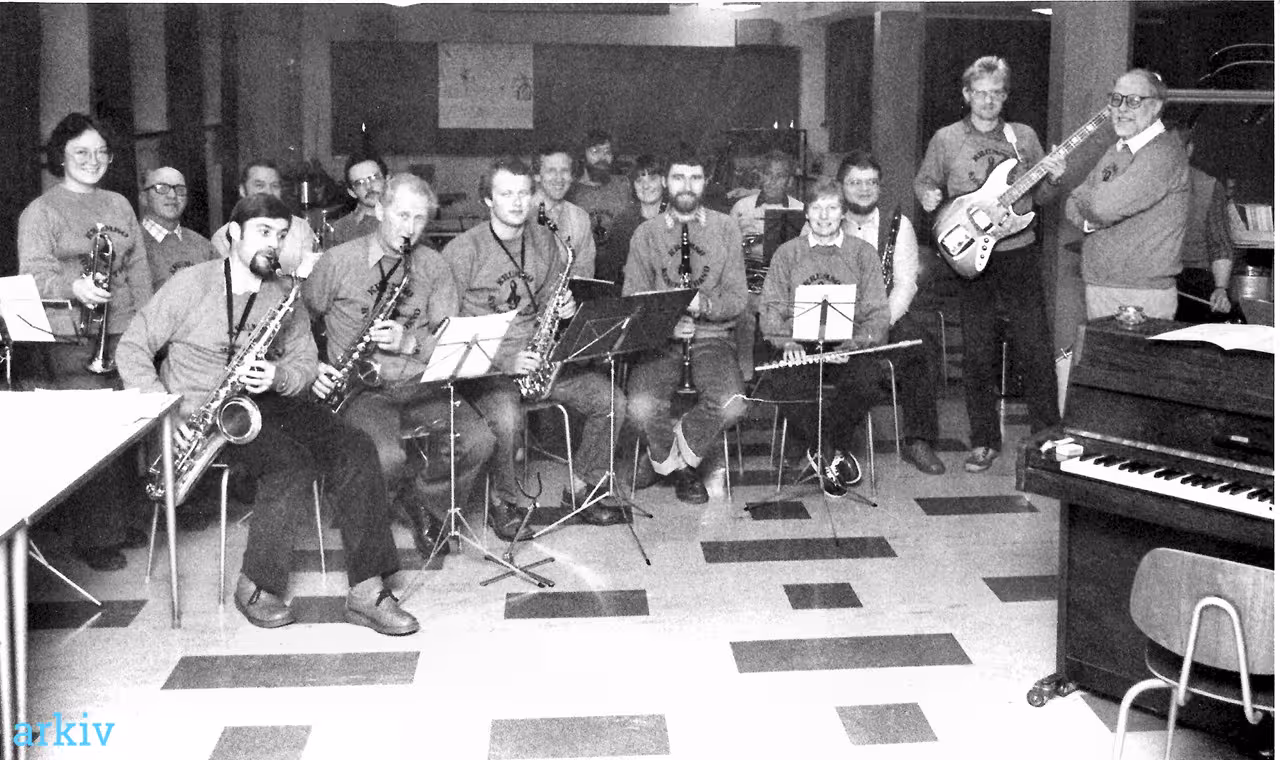 Wagtberg (V. Ulslev) ,Werner Sørensen, Jens Willebjerg. Med guitar Jesper Rasmussen (Kettinge), Eddie Bradford (klaver og dirigent/Nykøbing). Forrest fra venstre Pauli Jørgensen (Nysted),Svend Age Christensen (V. Ulslev), Bjarne Christensen (søn af S.Å.), Erik Damskier (Nysted), Astrid