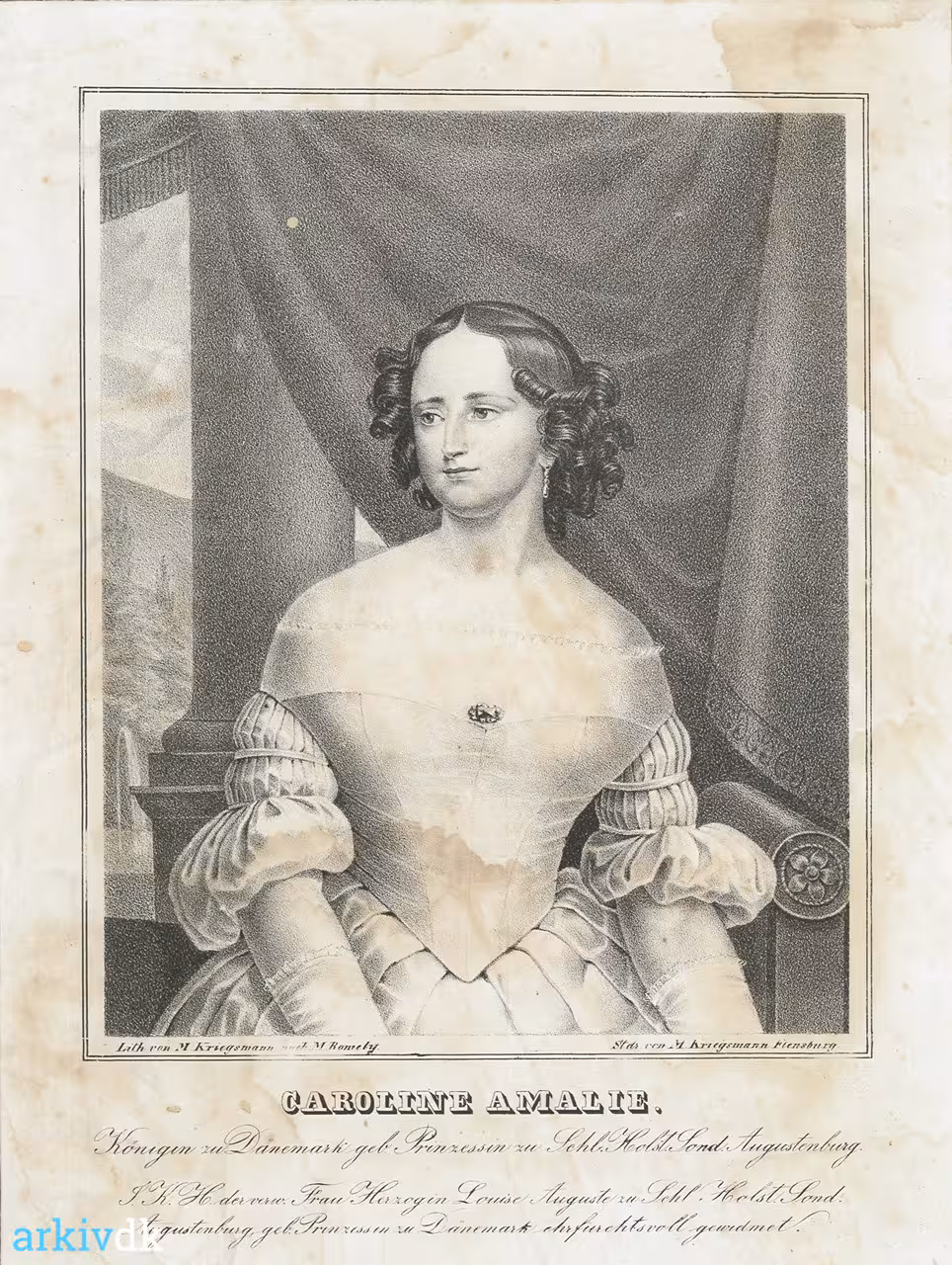 | Beskrivelse | Litografi med portræt af dronning Caroline Amalie (28.6. 1796 - 9.3. 1881). Hun var datter af hertuginde Louise Augusta og hertug Frederik Christian 2. af Slesvig-Holsten-Sønderborg-Augustenborg. Hun blev i 1815 gift med kronprins Christian Frederik, fra 1839 kong Christian 8. og var hans dronning frem til hans død i 1848. Litograferet af M. Kriegsmann, Flensburg. Tekst: Caroline Amalie. Königin Zu Dänemark geb. Prinzessin Zu Schl.Holst.Sond.Augustenburg. S.K.H. derverw. Frau Herzogin Louise Auguste Zu Schl.Holst.Sond.Augustenmburg geb. Prinzessin Zu Dänemarkehrffurchtsvoll gewidmet. Jvf. 00311D. Caroline Amalie |