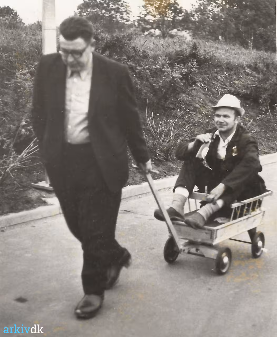 Beskrivelse Ernst Petersen og Kjeld Therkelsen på tur med legevogn.
