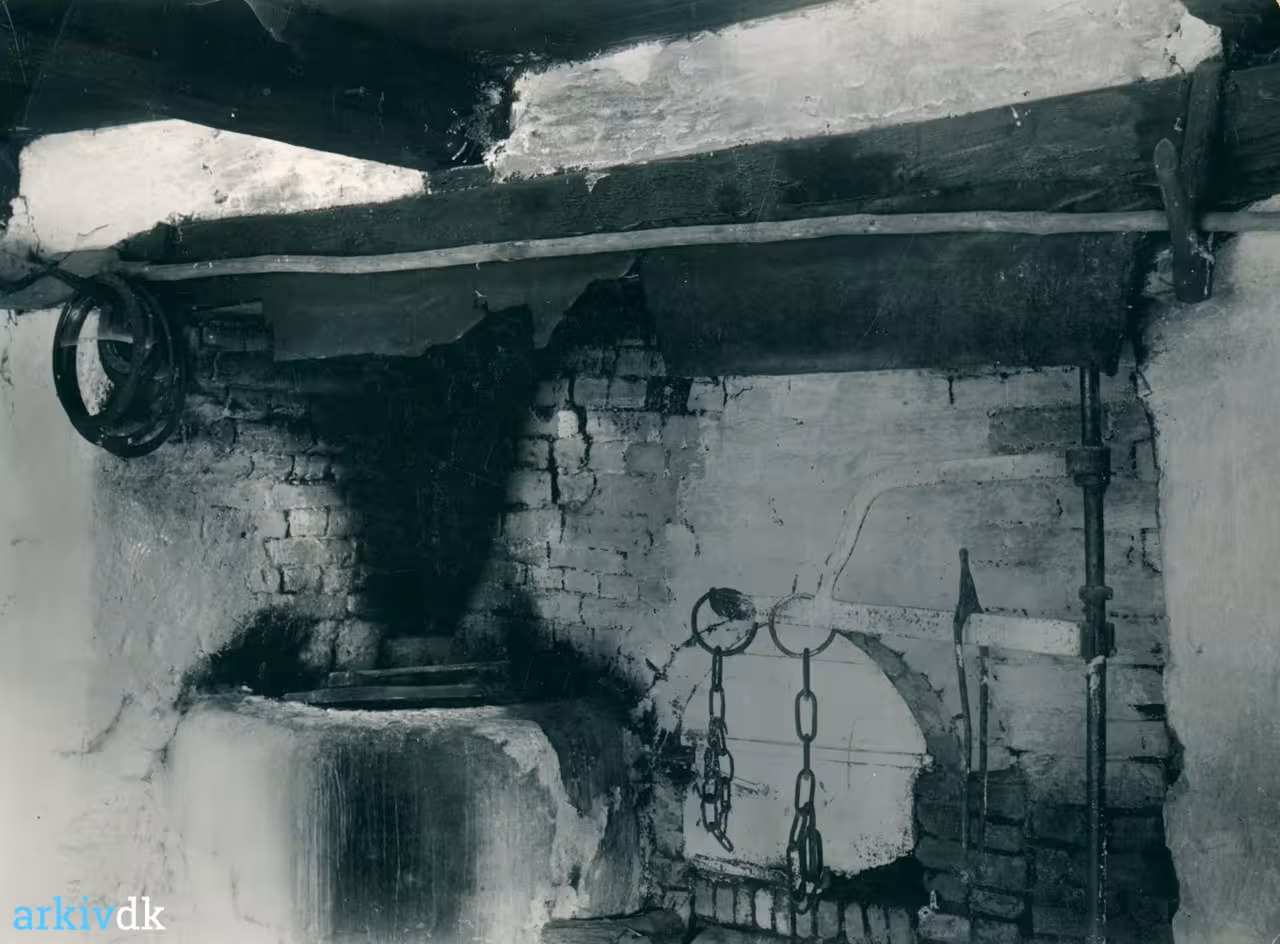 Beskrivelse | Åben skorsten med ildsted og bageovn på Jep Fallesens gård Østre Elberg i Barsmark o. 1925. |