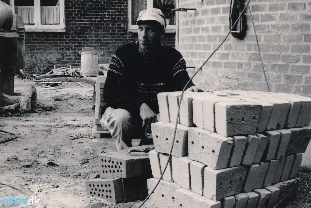 Beskrivelse Finn Kristensen i færd med at mure en skorsten op i Kjellerup.