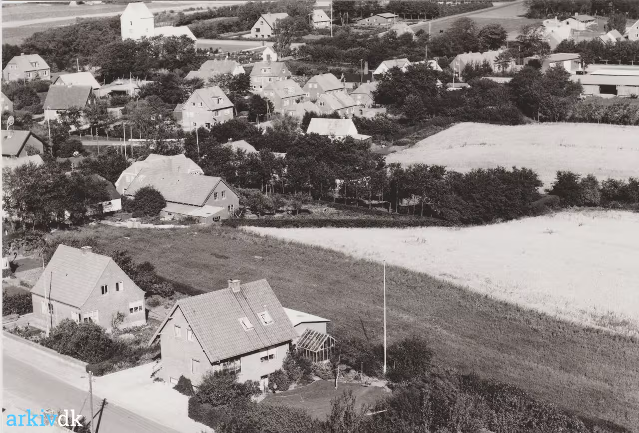 Vejen nederst i billedet - er Nøråvej. Det nederste hus ligger på Nøråvej 9, som blev bygget af murermester Harald Jensen - bestilt som aftægtsbolig til Laust Søndergaard fra "Søndergaard". Laust flyttede dog aldrig ind, så Harald Jensen flyttede selv ind, sammen med hustruen Agnes. Her voksede bl.a. sønnen Erling op - Erling overtog senere både firma og hus og i dag er firmaet vokset til Entreprenør Erling Jensen A/S. |