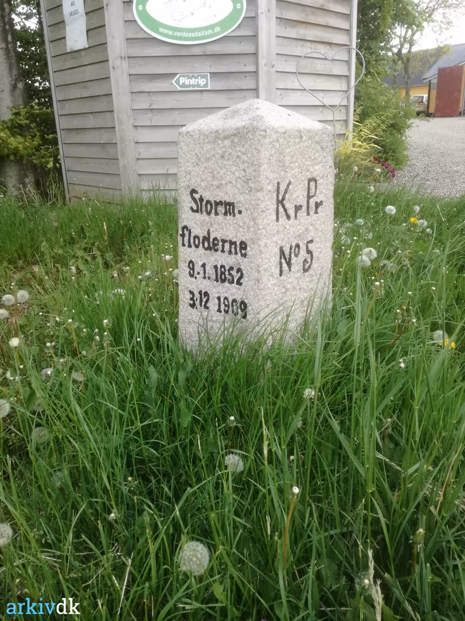 "Kr. Pr. No. 5" og på en anden side af stenen: "Stormfloderne 9.12.1952, 3.12.1909"