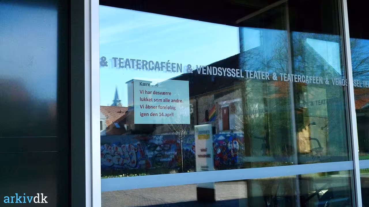 Beskrivelse Opslag vedr. Corona-lukning ved indgangen til teatercaféen Hos Uffe / Vendsyssel teater, Hjørring.