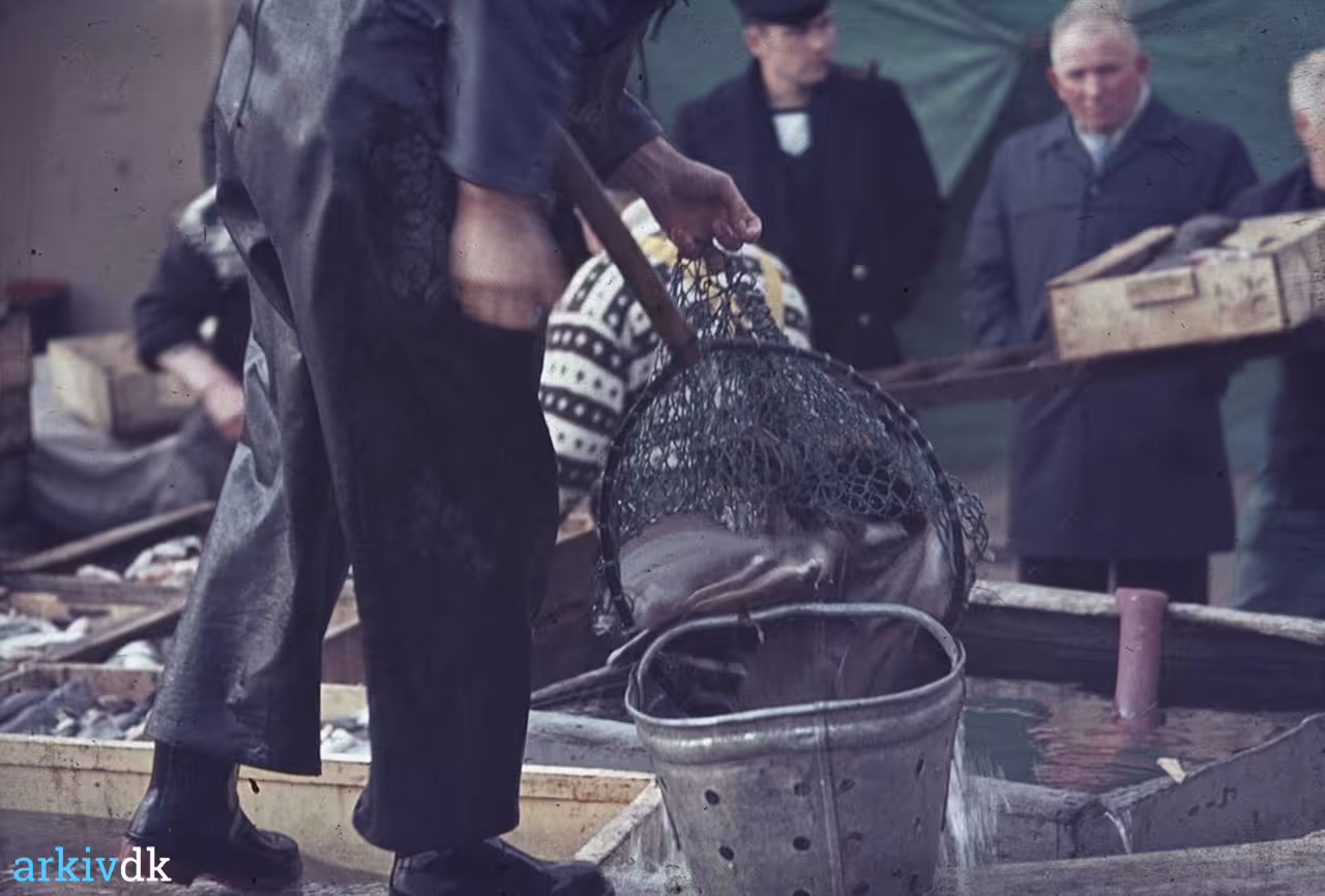 Bemærkning Fiskerne med fisk ombord Omøfærgen i Skælskør Havn ved Dampmøllen