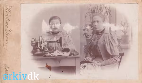 Den ene kvinde sidder ved en symaskine, mens den anden ser ud til at have sytøj eller et broderi i hånden.