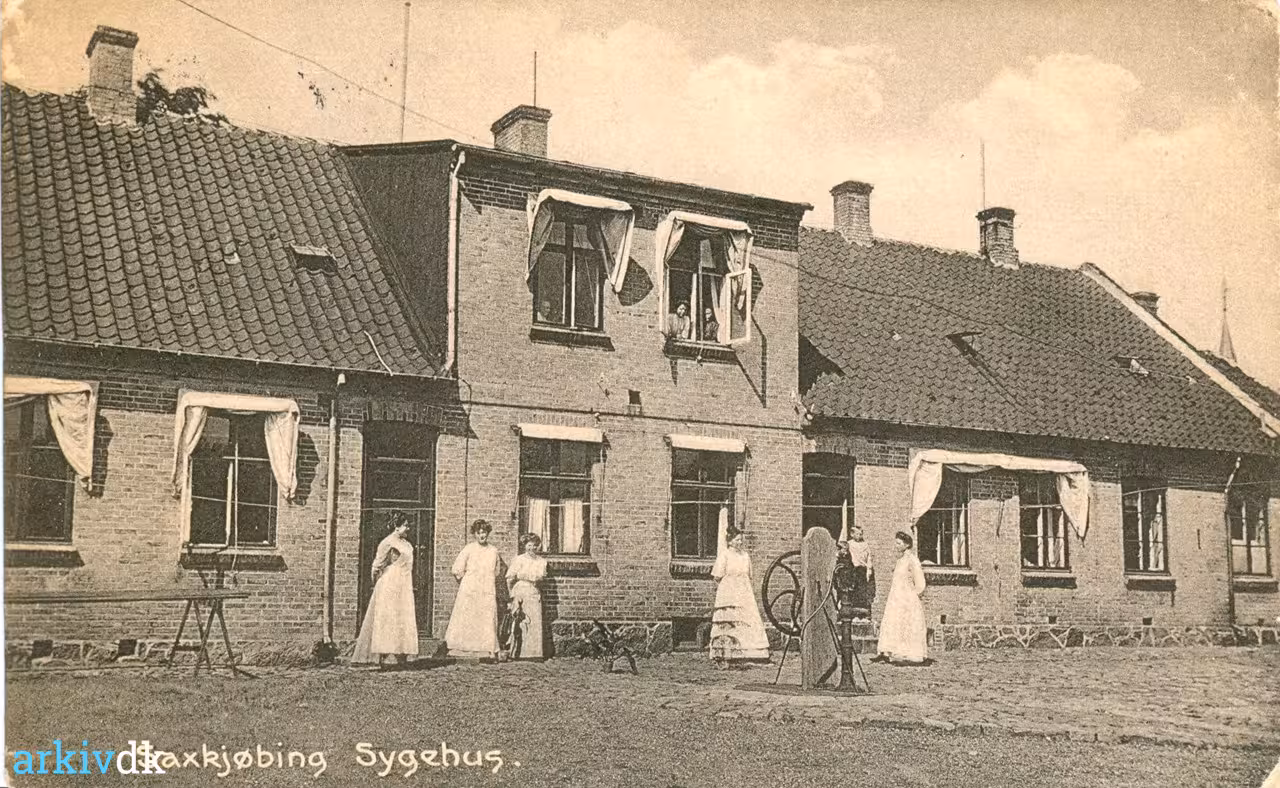Opført 1881 og har fungeret indtil 1984. Kaldes nu "Saxenhus" og rummer lægehus, kulturhus og lokalhistorisk arkiv. Midt i billedet ses fru.Olga Nielsen, oversygeplejerske og gift med dr. Nielsen, som har givet navn til plejecentret "Doktorparken". |