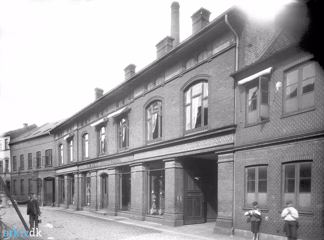I 1907 var der en cykelforretning, et sagførerkontor og et købmandskontor i bygningen. I dag finder du i den ene halvdel en fotoforretning og i den anden en modebutik.