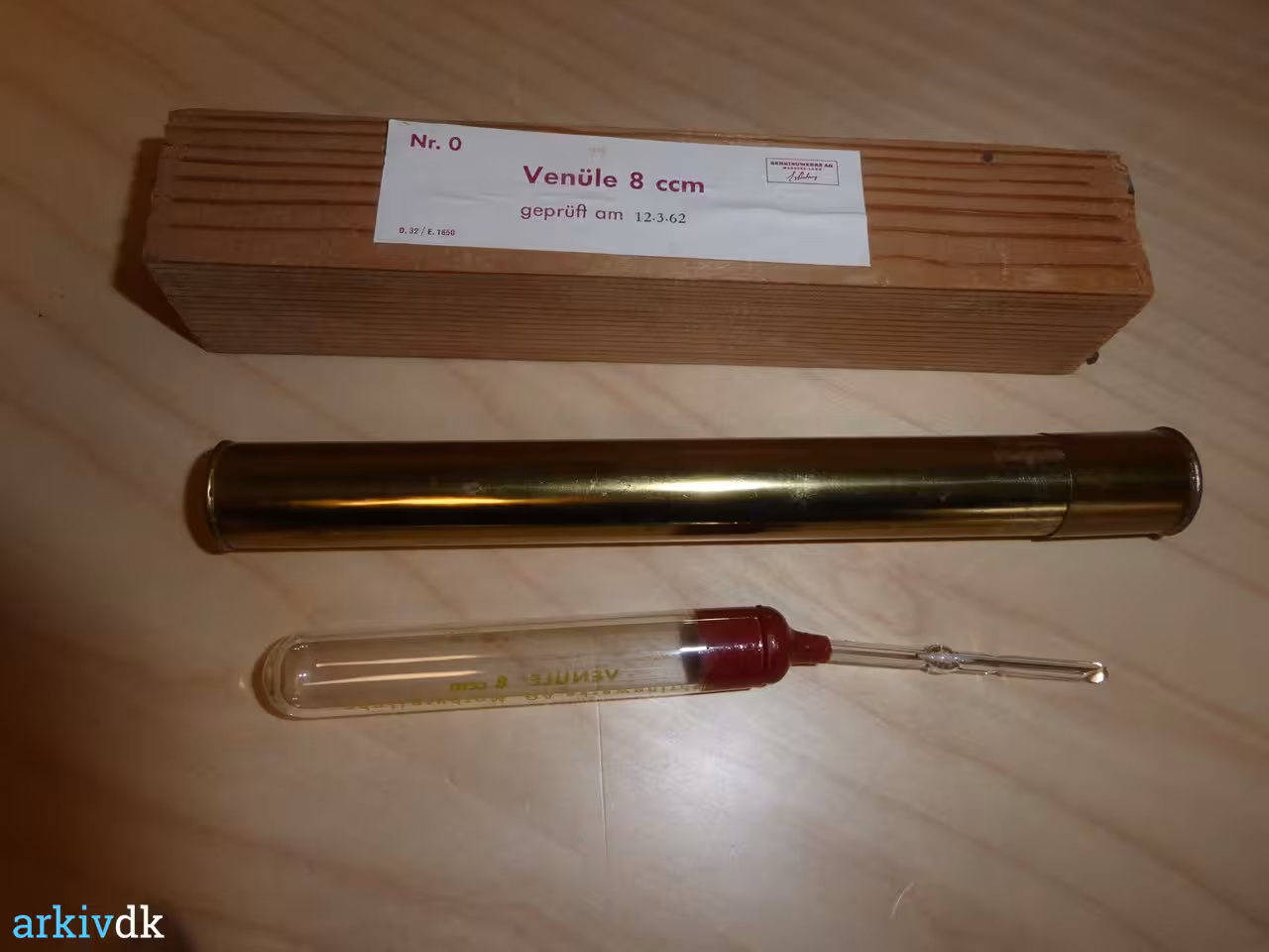 | Beskrivelse | Sterilt rødt (aneorob venyleglas 8cm til analyse ved svær infektion.Er opbevaret i metalhylster.og ligger i trææske |