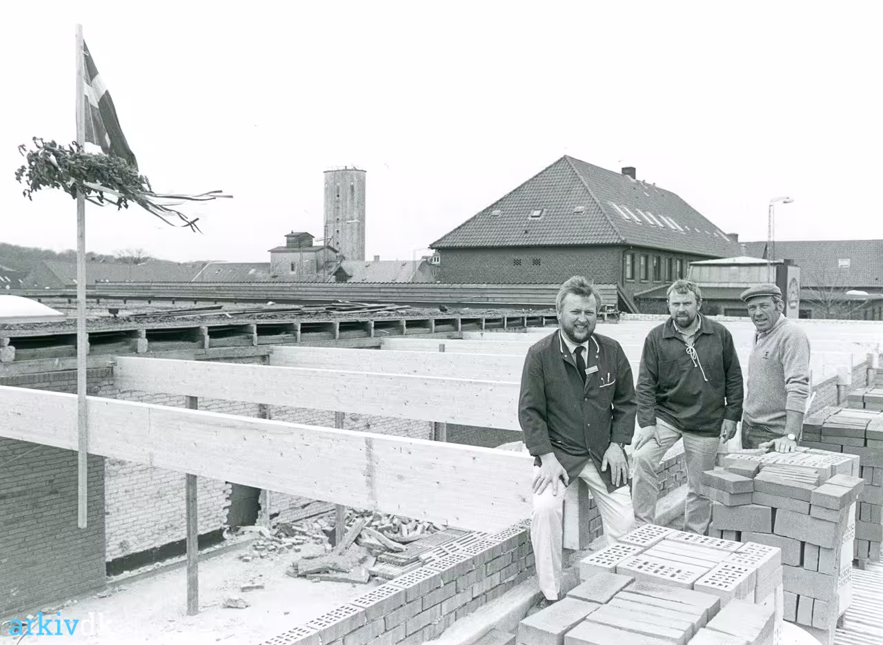 1 Uddeler Benny Sørensen, byggeleder Kurt Nielsen og formand for Brugsen Henning W. Lund på taget af tilbygningen. I baggrunden ses posthuset og silo ved Engen Johan Gadegaard