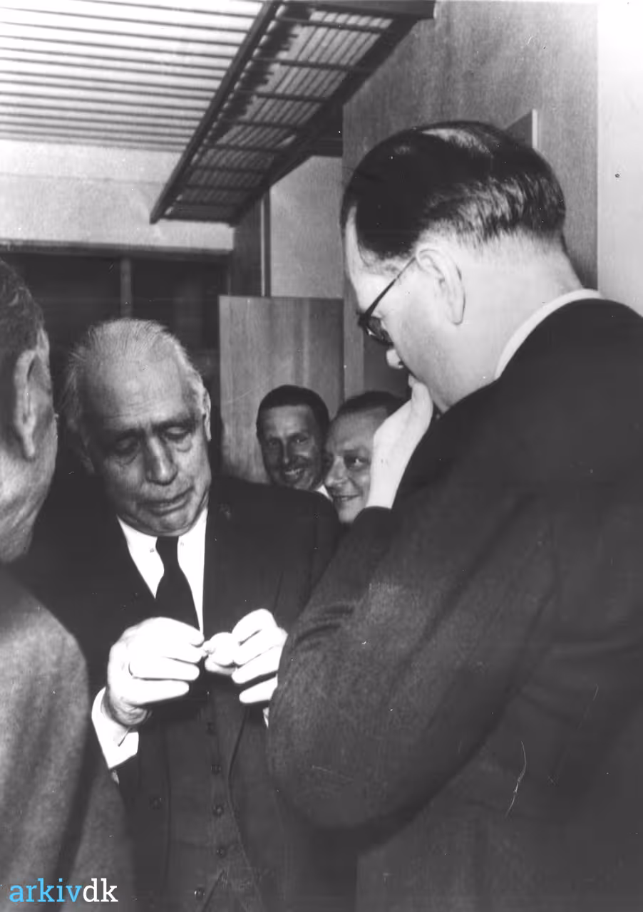 Niels Bohr and Tage Erlander at Lund University. Niels Bohr is demonstrating the "Tippetop".