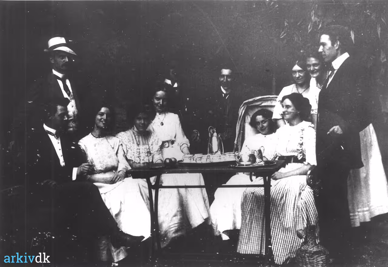 Edgar Rubin, Niels Erik Nørlund, Margrethe Bohr, Gerda Holbek, (?), Harald Bohr, Agnete Wæver, Johanne Skram, (?), Inge Hagemann and Niels Bohr in the Nørlunds' Garden, Slagelse.
