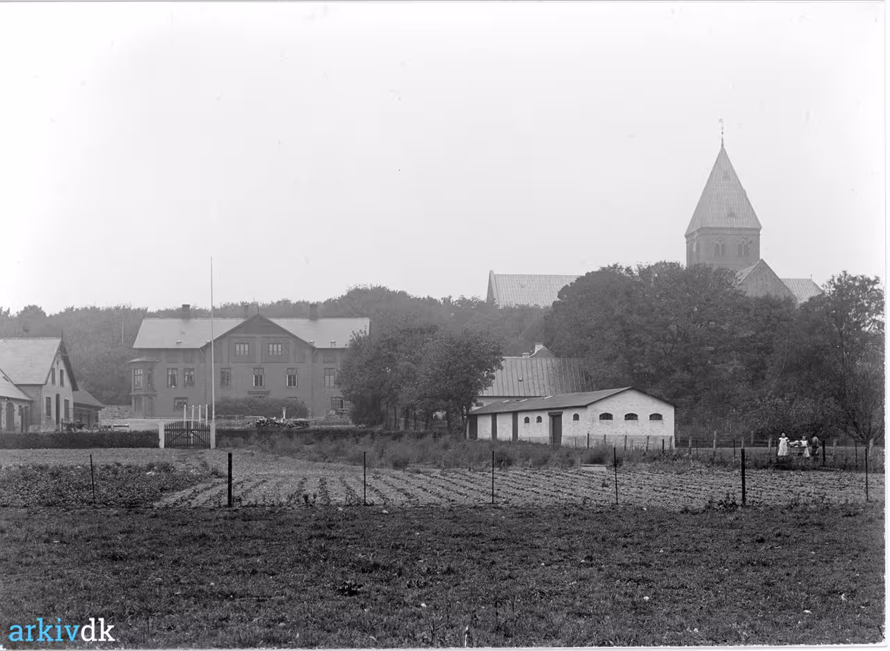 Beskrivelse Avlsgården og Forvalterboligen I baggrunden ses Sct. Bendts Kirke (7. dubletter i postkort)
