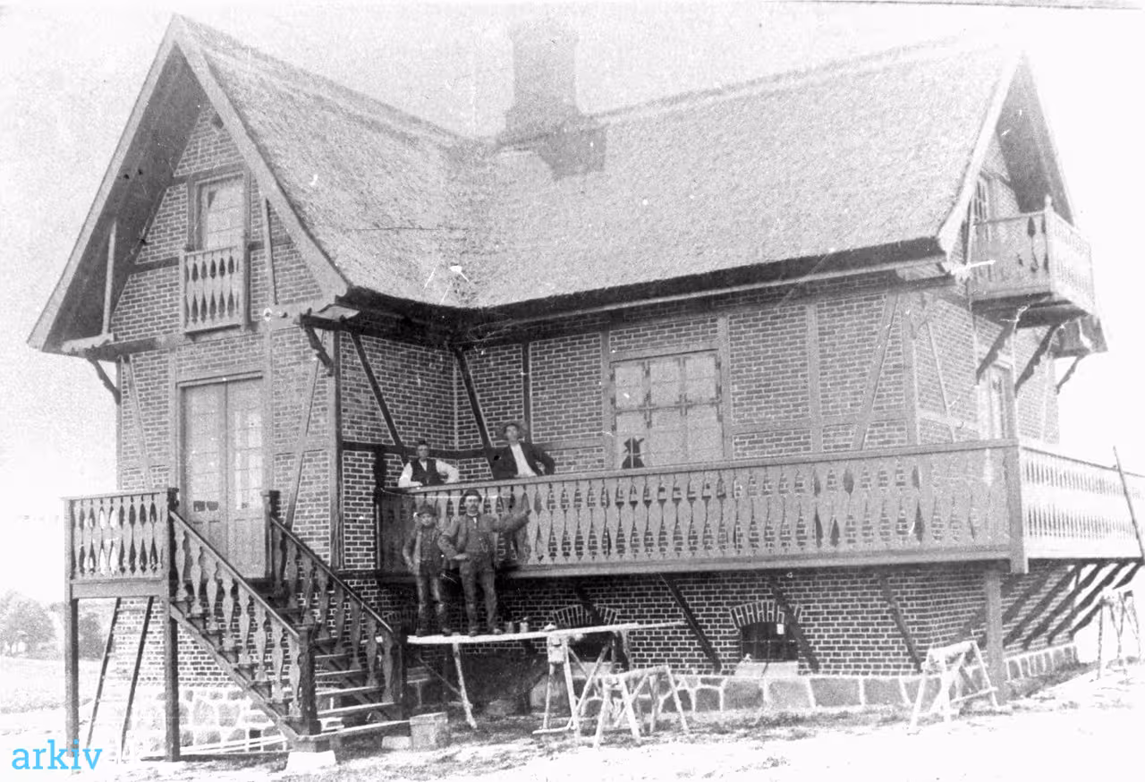 | Beskrivelse | Høed by, Valsølille sogn. matr. nr. 4d. Huset opført 1896 for Profesor Ernst Løffler, af tømrer Ernst Truelsen i Høed. manden øverst til venstre er tømrerlærling Peter Andersen, senere tømrermester i Jystrup |