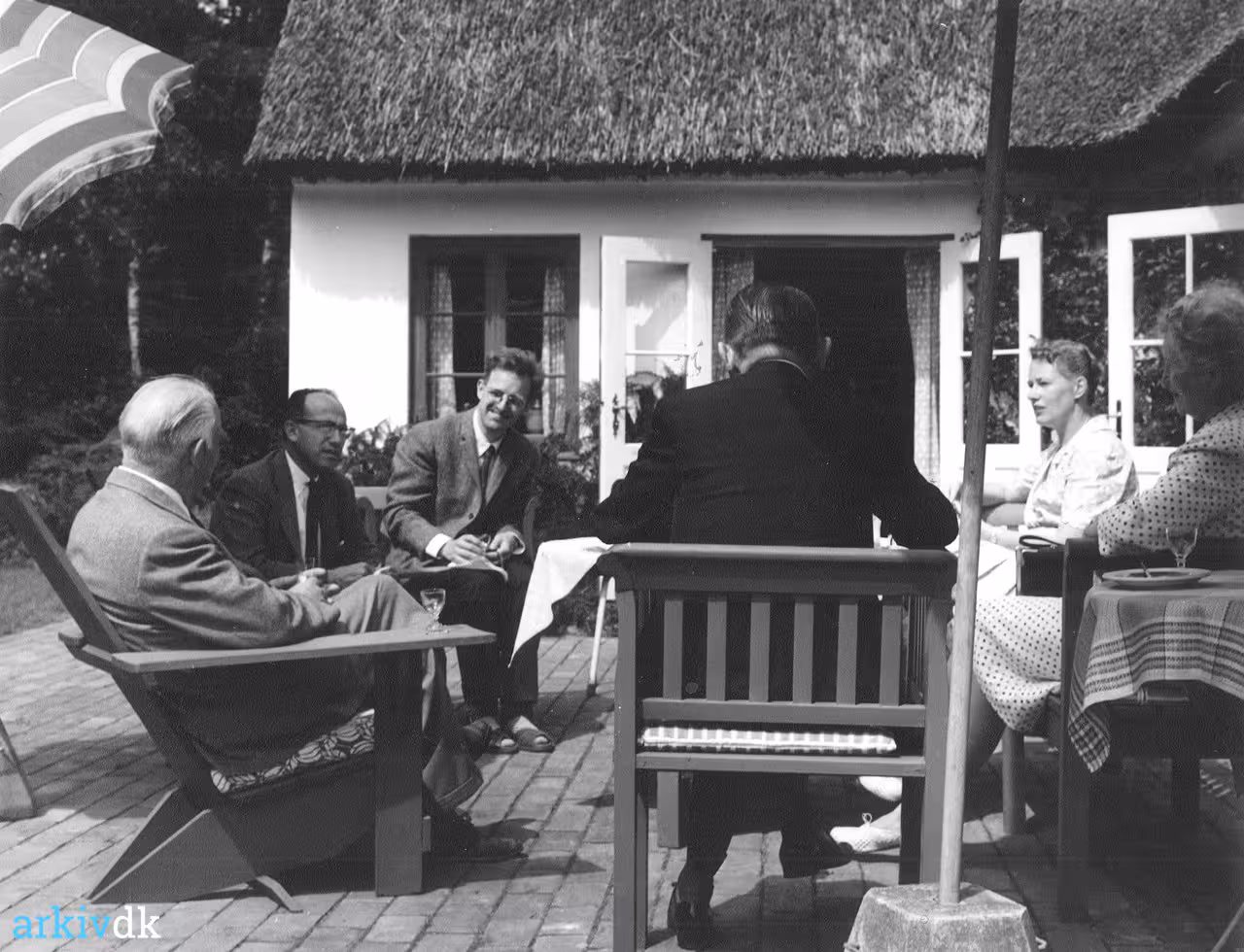 Niels Bohr, Jonas Salk, Hans Bohr, Basil O’ Connor, Ann Bohr and Margrethe Bohr at Bohr's summer house, Tisvilde, North Zealand, Denmark.