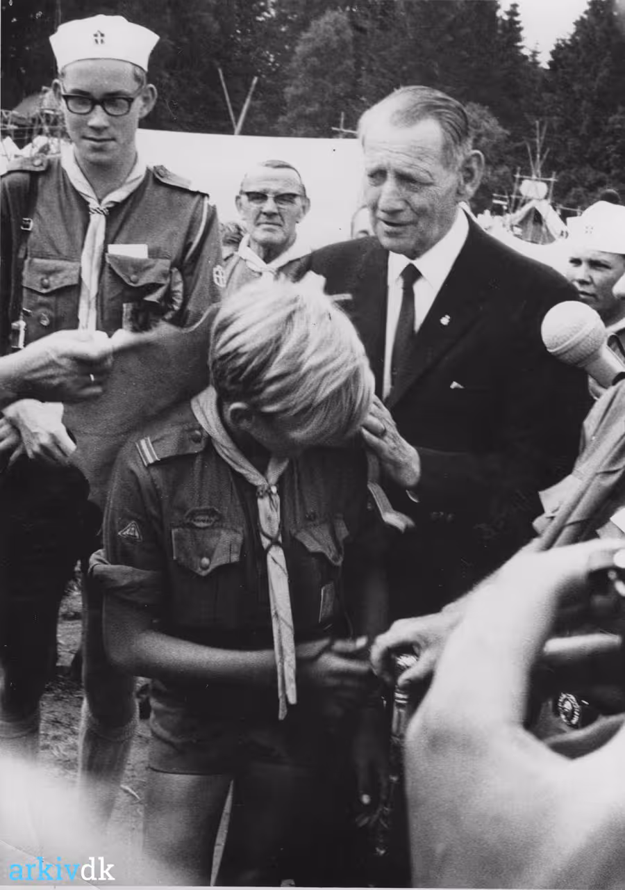 Beskrivelse Kong Frederik den 9. skriver sin autograf på et skind, som er lejrens gæstebog. Skindet ligger på ryggen af en FDF'er, der fungerer som skrivepult.