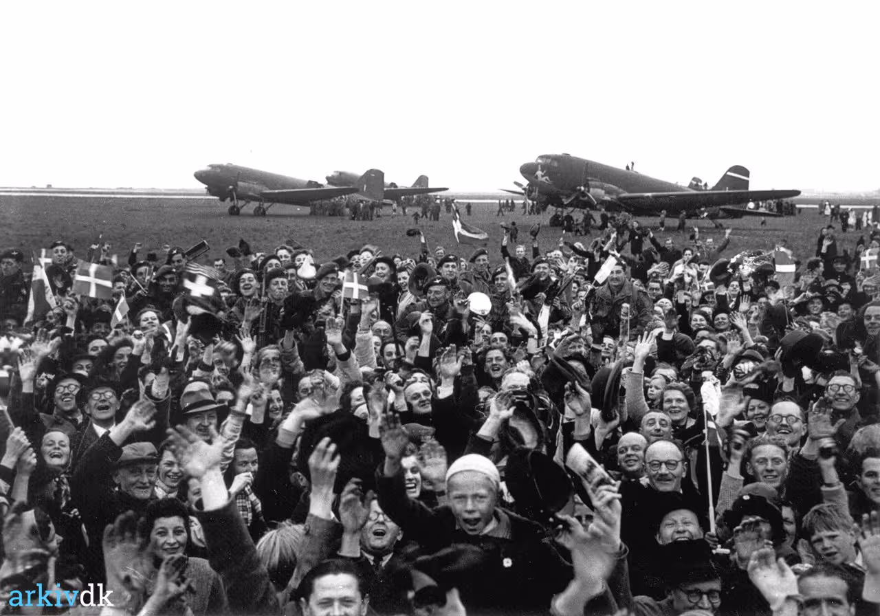 Allierede tropper og menneskemylder i Lufthavnen 5. maj 1945