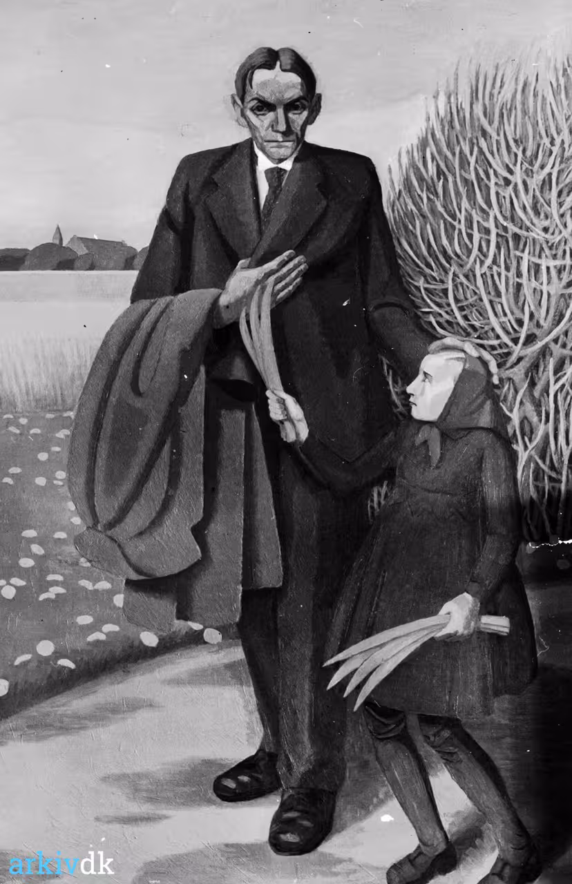 Foto af maleri, Olie på lærred forestillende Kaj Munk og en pige i et landskab.