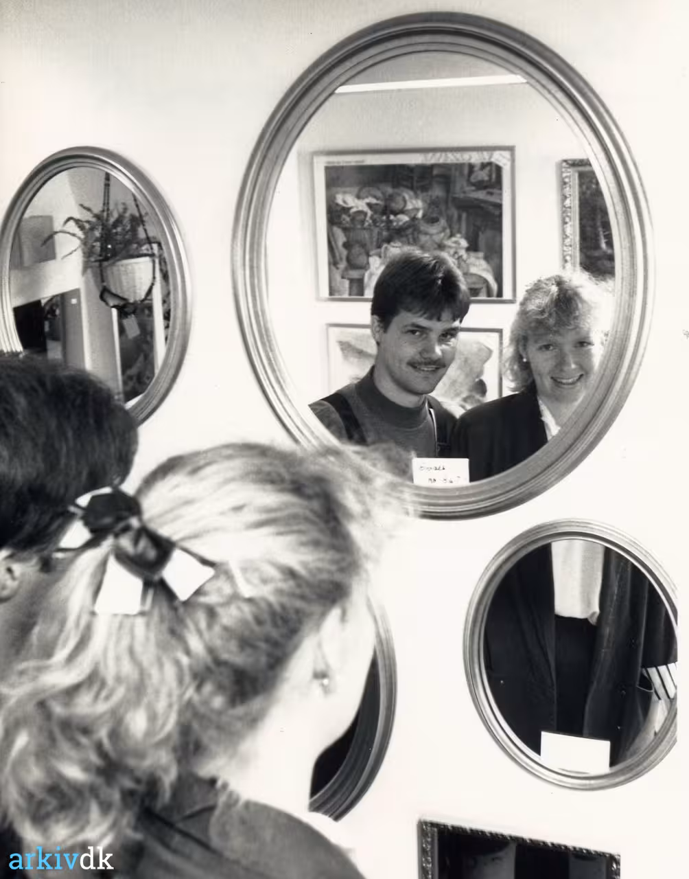 I forbindelse med overtagelsen af glarmesterforretningen er Tina Vest Hansen og Ole Kamper Jørgensen smart fotograferet i et af de udstillede spejle.