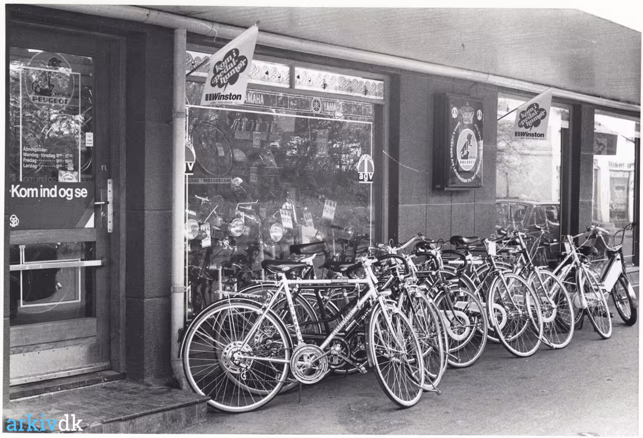 Asnæs Importen, Enghaven, Asnæs - hvor man ser butikken fra fortovet, med udstillingsvinduerne og med en del cykler og knallerter til udstilling foran på fortovet.
